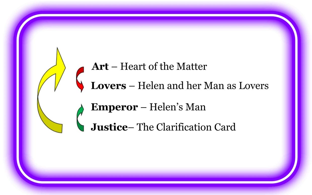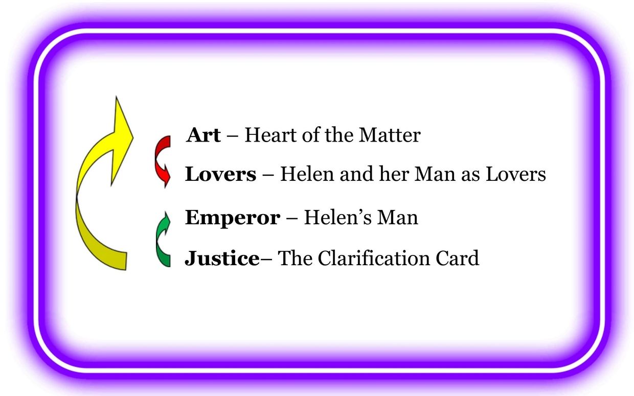 The Green Arrow from “Justice” to the “Emperor” is expressed as “Justice” to the “Emperor.” This dynamic represents that the man that Helen is going to meet will truly be right for her!