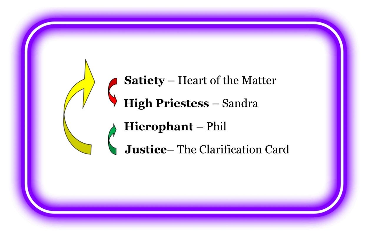 The Red Arrow from “Satiety” to the “High Priestess” is expressed as “Satiety” to the “High Priestess.” This dynamic represents that Sandra has already experienced all that there was to experience in her marriage with Phil as far as “marital bliss.”