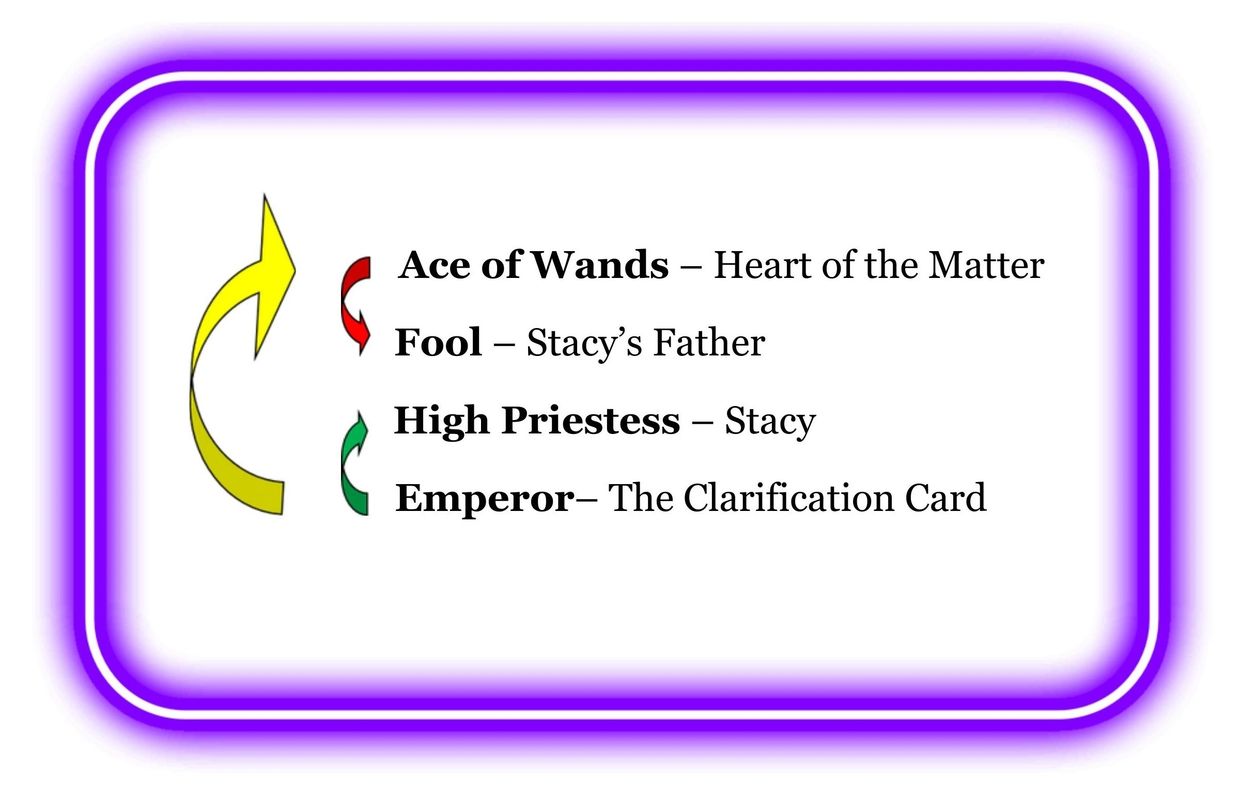 The Red Arrow from the “Ace of Wands” to the “Fool” is expressed as the “Ace of Wands” to the “Fool.” This dynamic represents that this time, Stacy’s father really desires to make things right with Stacy, and that he really has the resources to do so.